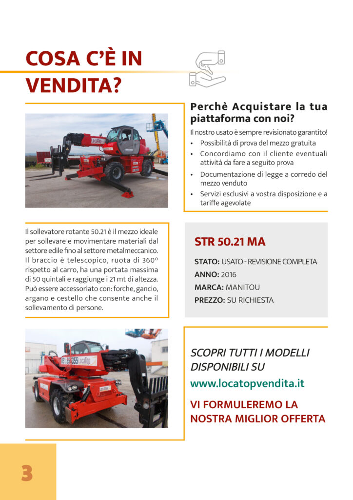 Inoltre, la macchina deve essere sottoposta a verifiche periodiche e manutenzioni, e coperta da adeguate polizze assicurative. Loca Top effettua revisioni del parco e garantisce macchine conformi.