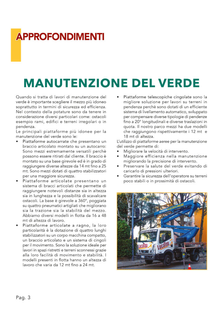 Infine, c’è un aspetto strategico che spesso fa la differenza: la flessibilità. Loca Top offre soluzioni su misura in base alla durata e alle caratteristiche del progetto, con formule che vanno dal noleggio giornaliero a quello full rent annuale. Questo approccio consente di accedere sempre a mezzi moderni e ben mantenuti, evitando le spese e gli impegni legati alla proprietà, come manutenzione ordinaria, verifiche periodiche, assicurazioni e gestione burocratica. Un vantaggio particolarmente rilevante per chi effettua potature saltuarie, lavori stagionali o interventi su commessa, dove la necessità di un mezzo può variare nel tempo.